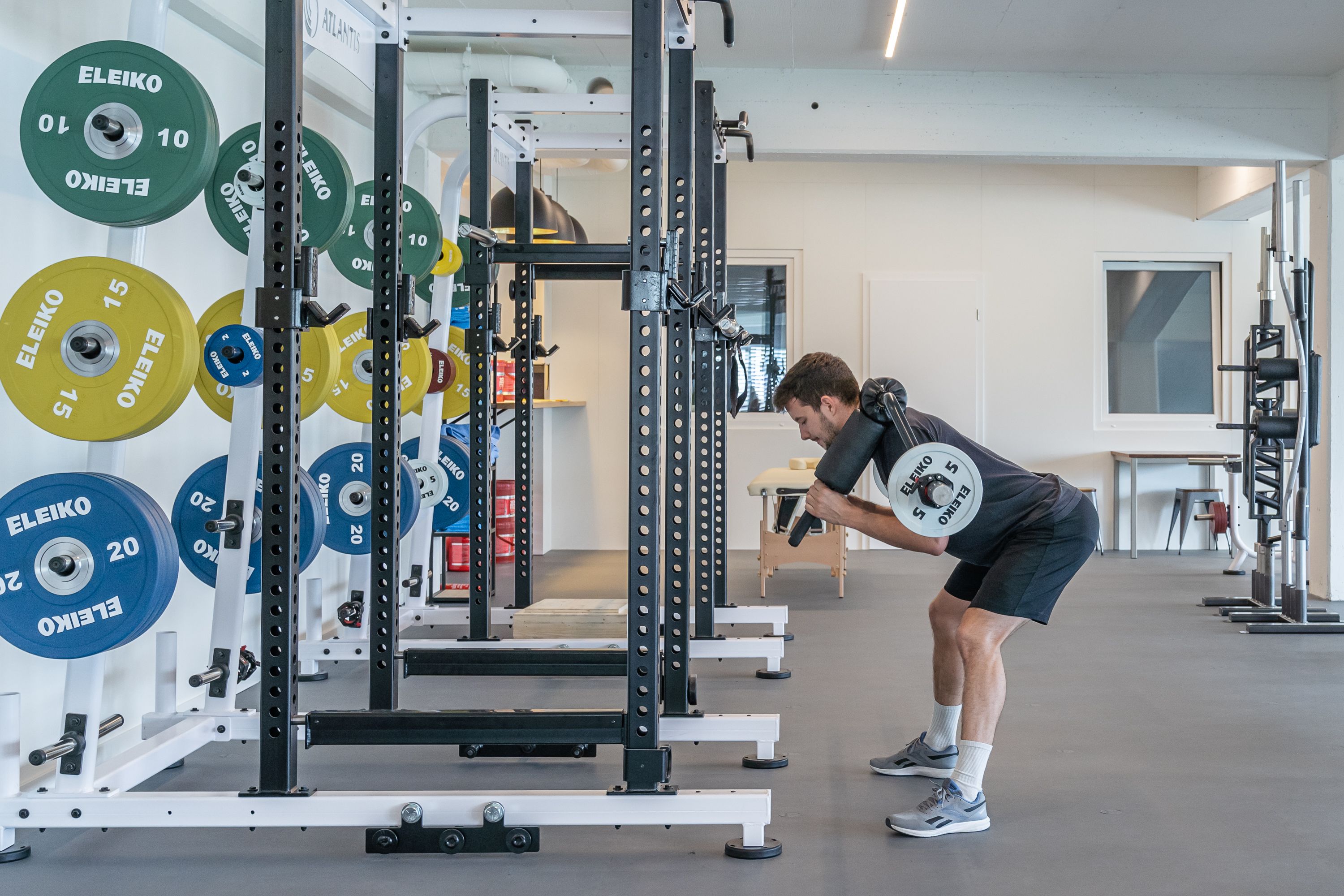 Im Bild zu sehen ist der EHC Olten Profi Cedric Maurer bei ausführen eines Good Morning mit der Safety Bar im CoSaH Studio Olten.