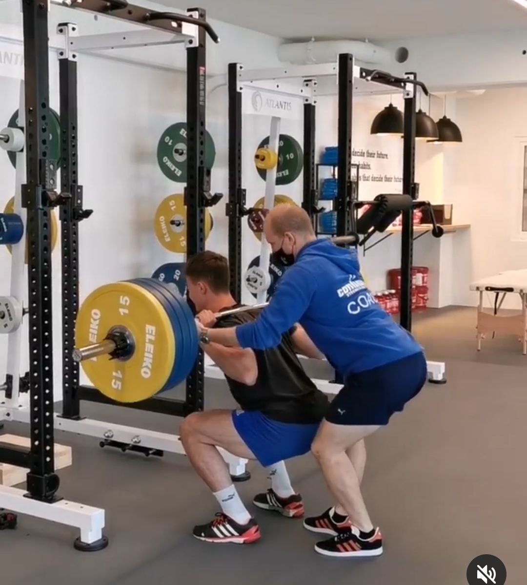 Maximalkraft: In der hohen Kniebeuge auf Pins konnte er einfache 220kg bewegen, ein weiteres Beispiel wie gut der Übertrag einer Full Range Kniebeuge ist.