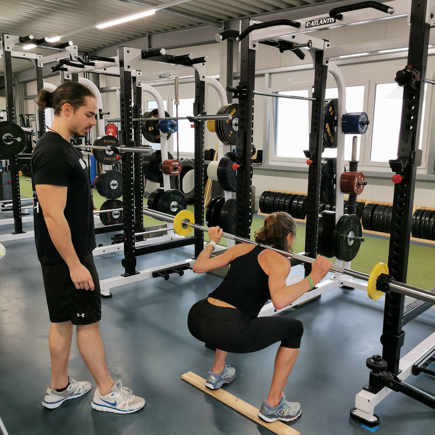 Im Bild zu sehen ist Coach Oli mit CoSaH Kundin Doris bei der ersten Session mit Squats. Sie hat lange Oberschenkel, hatte Kniereha hinter sich und eingeschränkte Fussgelenkmobilität. Kann aber trotzdem eine gute (angepasste) Kniebeuge ausführen.