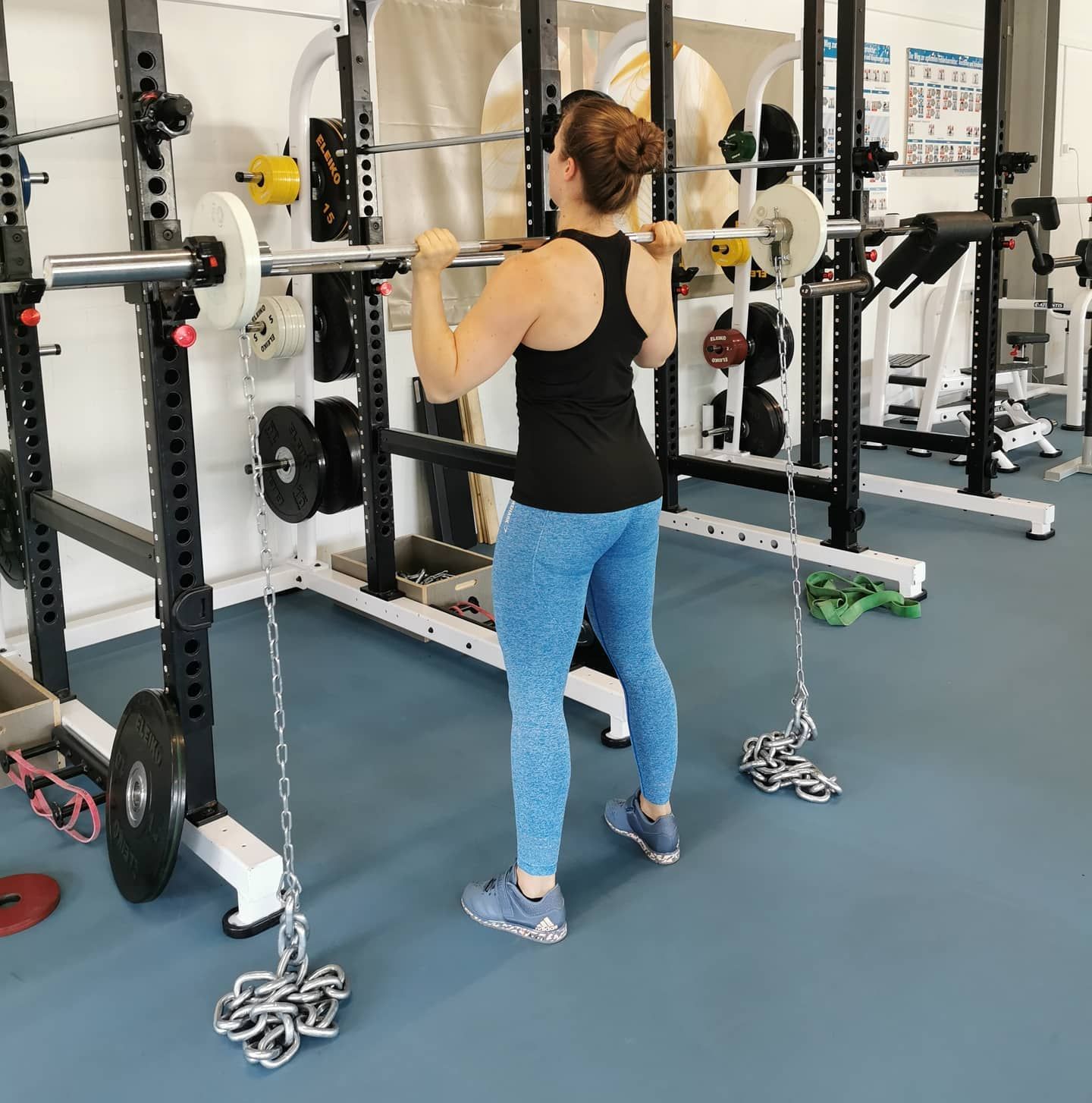 Im Bild zu sehen ist CoSaH Coach Ramona bei Military Presses mit Ketten.