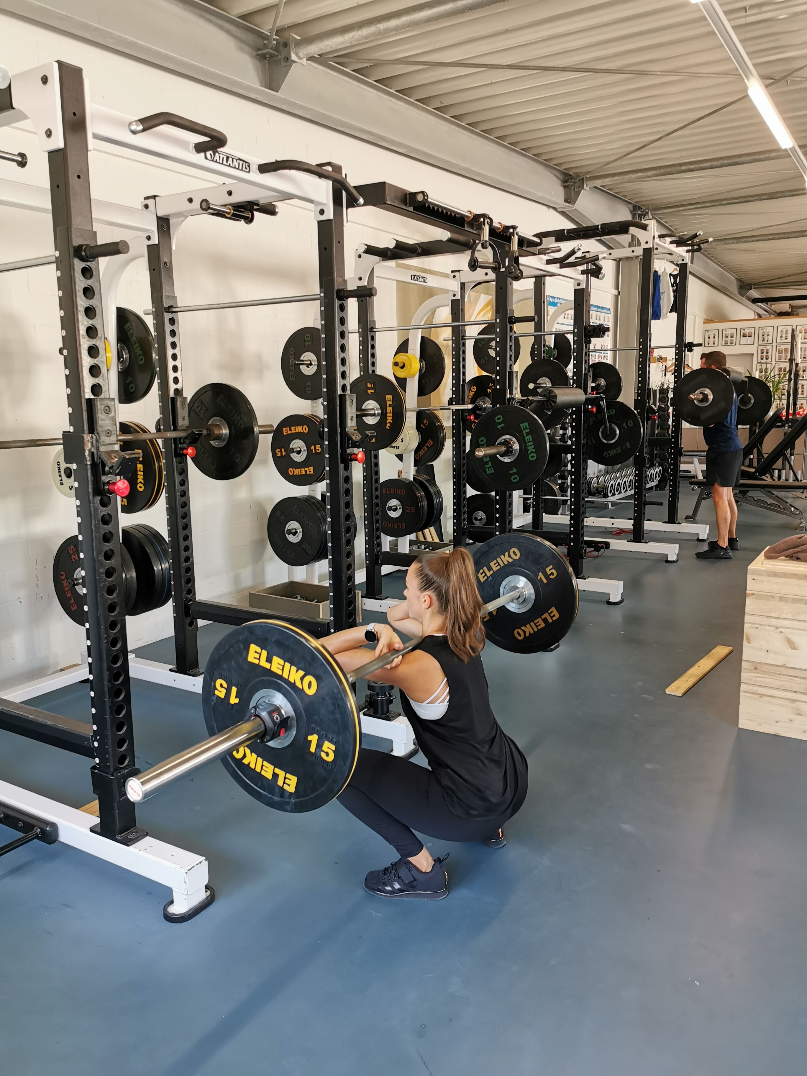 Im Bild zu sehen ist Coach Martina bei pausierten Front Kniebeugen in der tiefen Position.